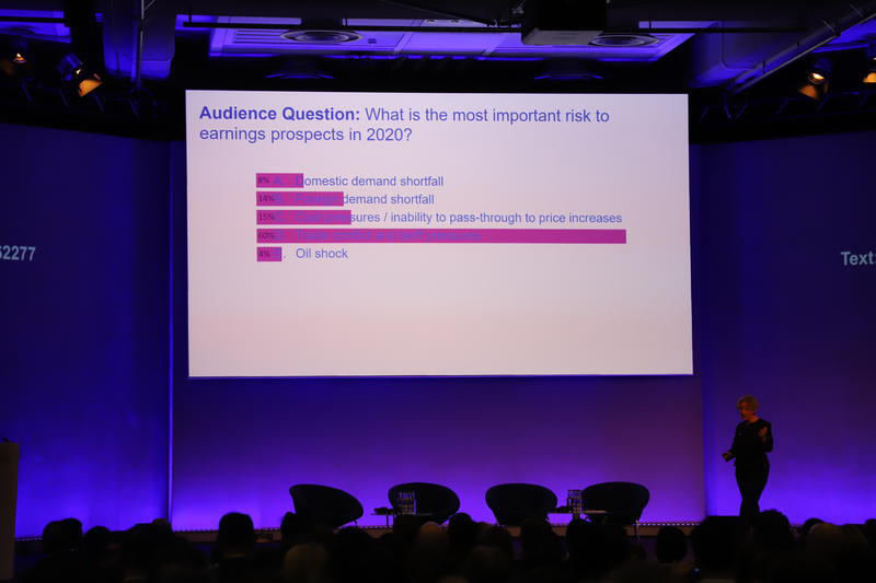 那么,影響2020年經(jīng)濟增長的風險因素中,哪個最重要呢?60%觀眾選擇了貿(mào)易紛爭和關(guān)稅壓力,其次是成本壓力/價格上漲(15%)、國外需求短缺(14%)、國內(nèi)需求短缺(8%),最后是石油市場不穩(wěn)定(4%)。我同意你們的選擇。但也有一些很有意思的值得討論的地方。